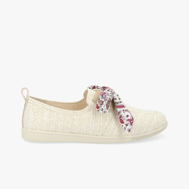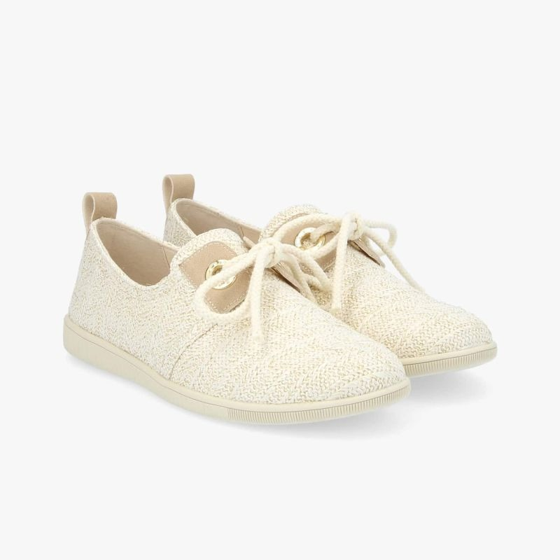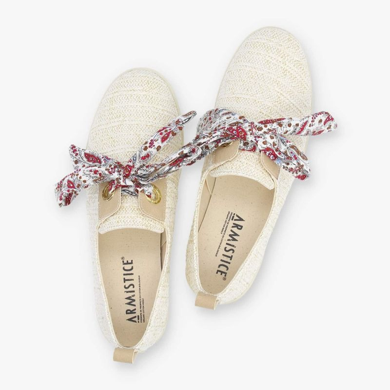 LA STONE ONE SE REVISITE DANS UNE VERSION ESTIVALE TRÈS NATURELLE. UNE TENNIS EN RAPHIA NATUREL BLANC INCRUSTÉ DE FIL DORÉ, AGRÉMENTÉE DEMPIÈCEMENTS BEIGE SUR LA LANGUETTE ARRIÈRE ET SOUS LES OEILLETS, OFFRANT UN LOOK AUTHENTIQUE ET RÉCONFORTANT. SUR CETTE PETITE ARMISTICE ON RETROUVE UN JOLI LACET CORDE QUI COULISSE DANS LES ICONIQUES ILLETS EN MÉTAL DORÉ.