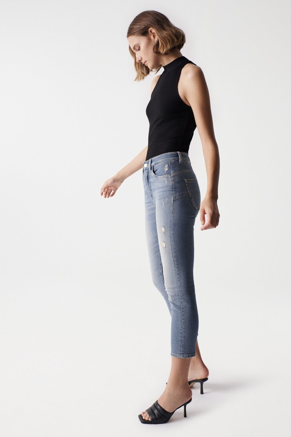 JEAN FAITH PUSH IN. JAMBE CROPPED SLIM. TAILLE HAUTE. LÉGER EFFET DÉLAVÉ. FERMETURE ÉCLAIR ET BOUTON. CINQ POCHES. PASSANTS. DÉTAIL SUR LA CINQUIÈME POCHE ET DÉCHIRURES LE LONG DE LA JAMBE.