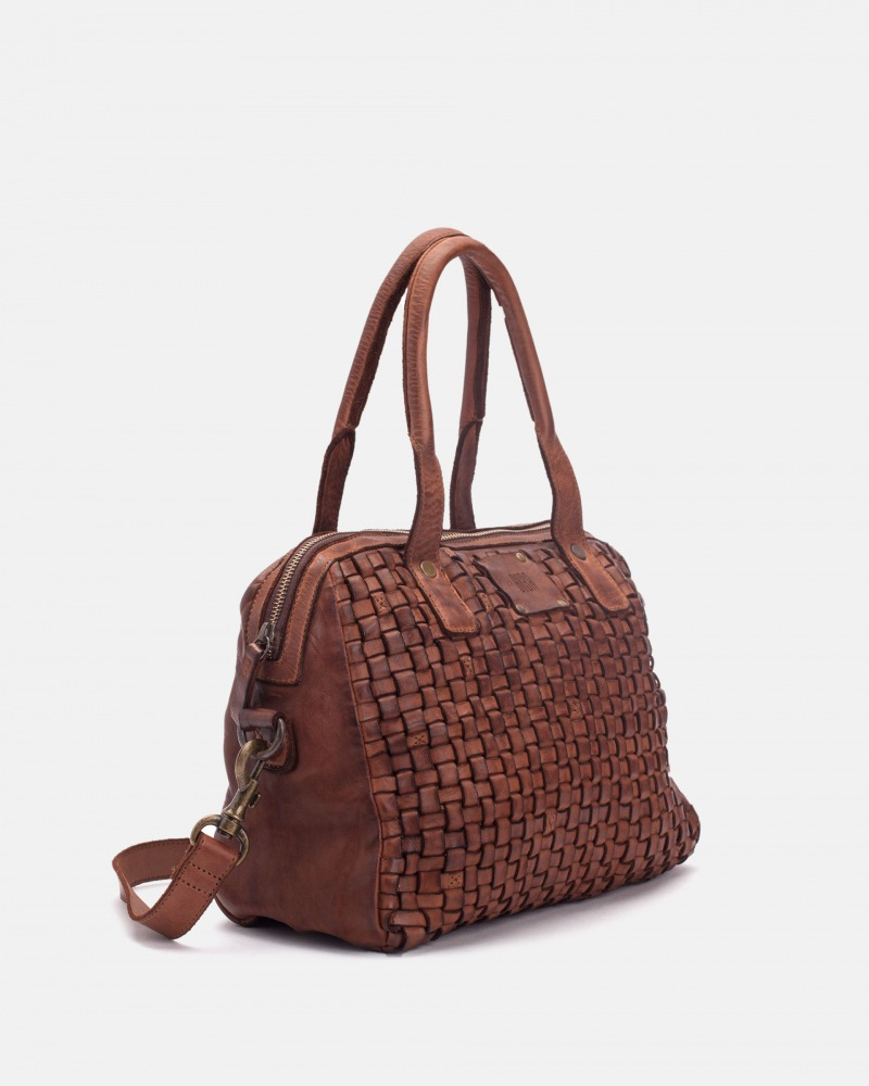 WASHED, VEGETABLE-TANNED, AND HAND-BRAIDED COWHIDE LEATHER BOWLING BAG. HANDLES, ADJUSTABLE AND REMOVABLE SHOULDER STRAP, ZIP CLOSURE, INTERNAL AND EXTERNAL POCKETS, AND COTTON LINING.