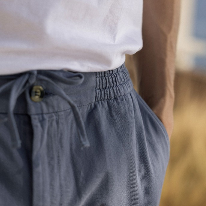 INSPIRÉ DU SPORTSWEAR PAR SA TAILLE ÉLASTIQUÉE, LE PANTALON DREUILLE BLEU EST UN COMPROMIS PARFAIT ENTRE ÉLÉGANCE ET CONFORT. LES DÉTAILS DE POCHE ET LA QUALITÉ DU TISSU LUI CONFÈRE CE STYLE UNIQUE. SA COUPE EST LÉGÈREMENT FUSELÉE À LA CHEVILLE. POINTS CLÉS : MATIÈRE CHEVRON TAILLE ÉLASTIQUÉE AVEC CORDON DE SERRAGE INTÉRIEUR COUPE FUSELÉE LOGO ARBRE EN FEUTRE 1 ARBRE PLANTÉ
