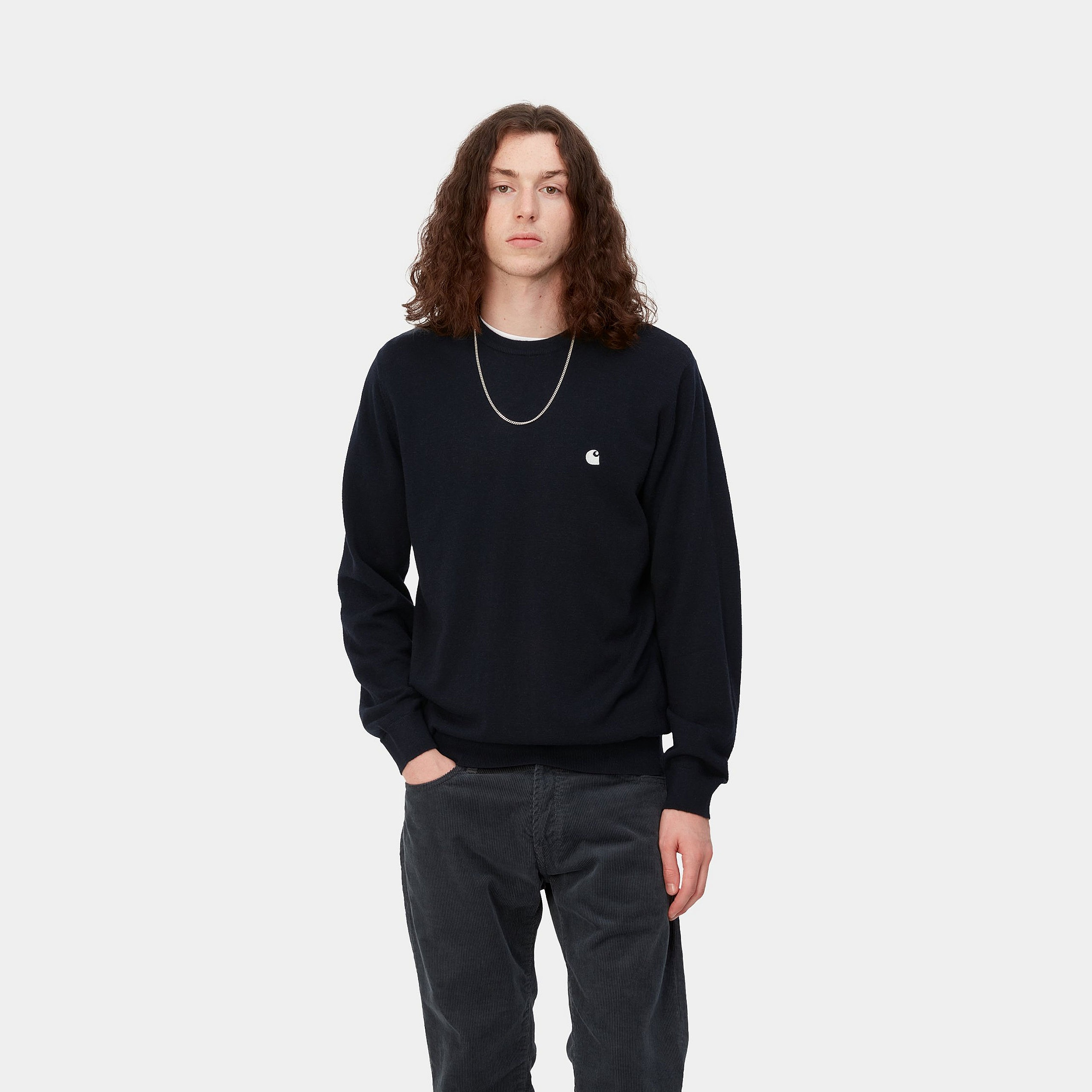 TRICOTÉ DANS UN DOUX MÉLANGE DE LAINE DAGNEAU ET DE NYLON, LE PULL MADISON ADOPTE UNE COUPE CLASSIQUE À MAILLE CÔTELÉE AU COL, À LOURLET ET AUX POIGNETS. CE MODÈLE EST BRODÉ DU LOGO C DE CARHARTT WIP SUR LA POITRINE.