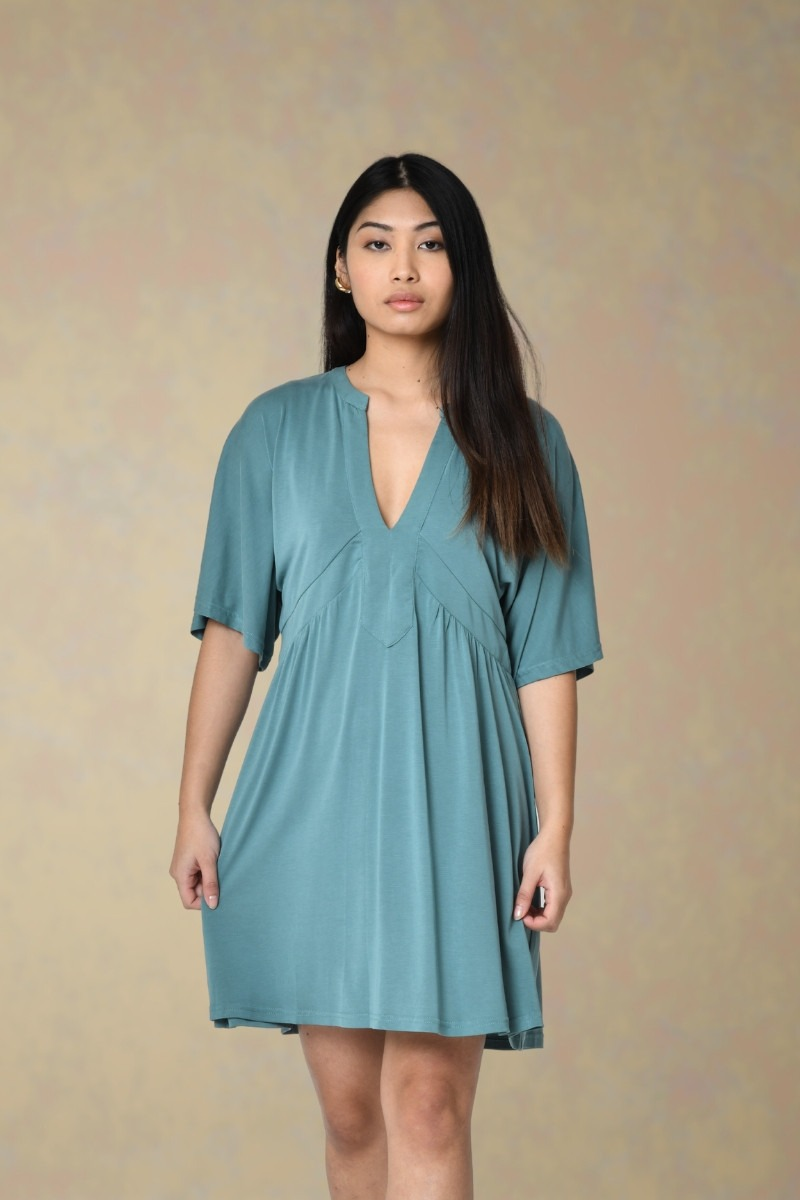 MARILOU EST UNE ROBE COURTE À MANCHES COURTES DE STYLE PAGODE, AVEC UNE COUPE ÉVASÉE. ELLE PRÉSENTE UN DÉCOLLETÉ EN V À L'AVANT ET EST CINTRÉE À LA TAILLE POUR METTRE EN VALEUR LA SILHOUETTE.
