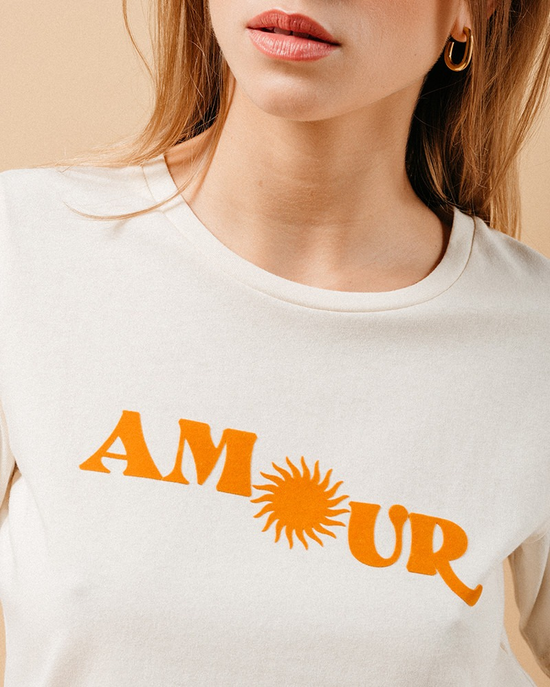 CASUAL ET DÉCONTRACTÉ, LE TOP POUR FEMME MARISOL EST UN PETIT BASIQUE À AVOIR DANS SON DRESSING. ON ADORE SON PETIT MESSAGE ""AMOUR"" IMPRIMÉ EN VELOURS. UN BEAU MESSAGE À ARBORER DURANT TOUTE LA JOURNÉE. ON ADORE SA COUPE CLASSIQUE QUI PEUT ÊTRE ASSOCIÉE À N'IMPORTE QUELLE PIÈCE DE VOTRE DRESSING.