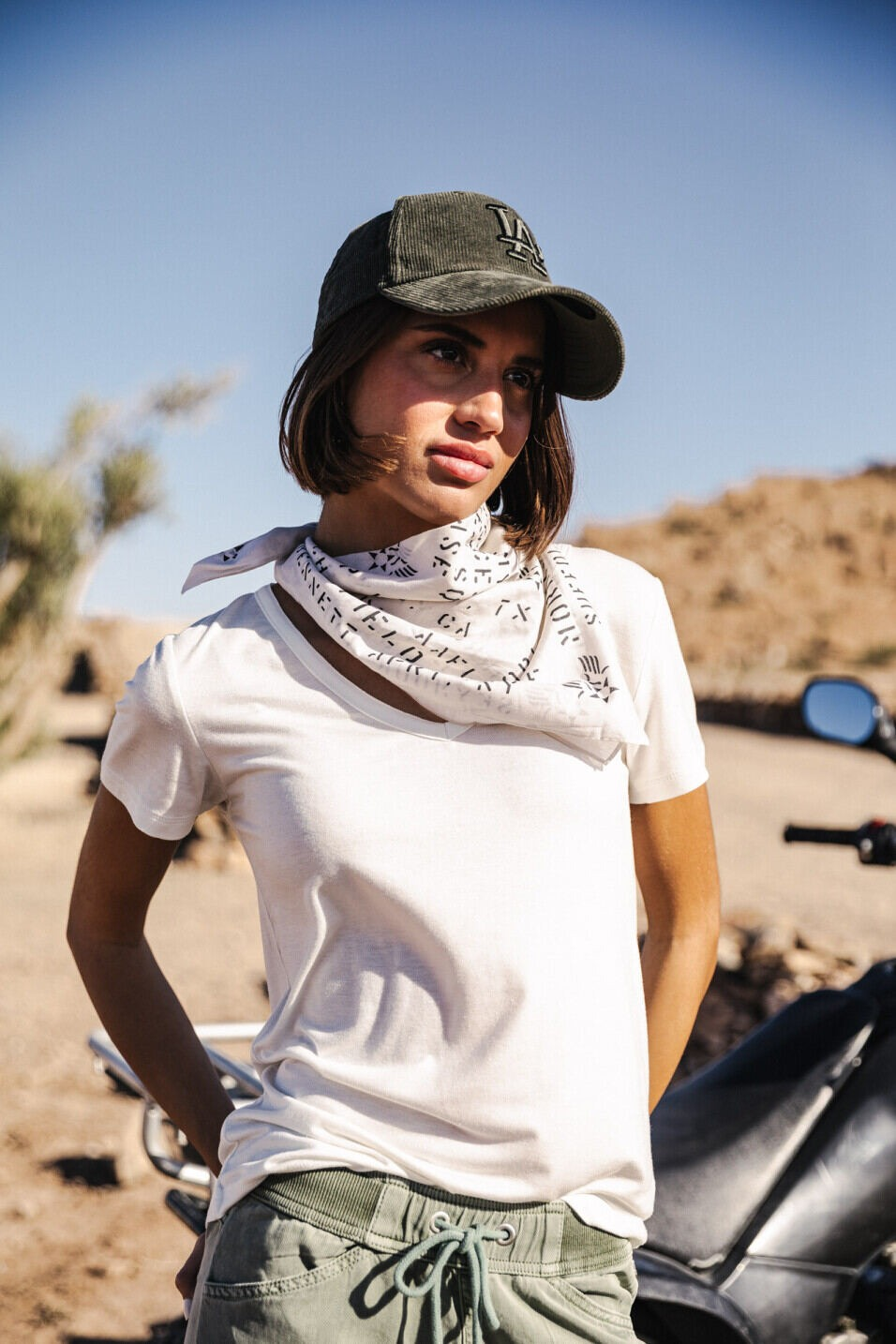 T-SHIRT COUPE AJUSTÉE À MANCHES COURTES COL V COUPÉ BORD FRANC AVEC PETITS BOUTONS TON SUR TON SUR LE BAS DU COL À GAUCHE ICON EN STRASS DANS LE DOS